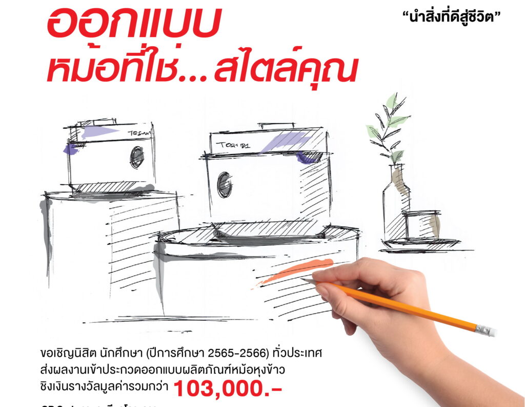 บริษัท ไทยโตชิบาอุตสาหกรรม จำกัด (Thai Toshiba Electric Industries Co., LTD.: TTEI) ผู้ผลิตผลิตภัณฑ์เครื่องใช้ไฟฟ้าในบ้าน จัดกิจกรรมโครงการประกวดผลงานการออกแบบผลิตภัณฑ์หม้อหุงข้าว สำหรับสถาบันอุดมศึกษา ปีการศึกษา 2565 – 2566 ภายใต้แนวคิด “TOSHIBA RICE COOKER Design Contest 2022 : นำสิ่งที่ดีสู่ชีวิต” เพื่อพัฒนาศักยภาพด้านการออกแบบและพัฒนาผลิตภัณฑ์เครื่องใช้ไฟฟ้า ผ่านการเปิดโอกาสให้นิสิตนักศึกษาระดับปริญญาตรีและบัณฑิตศึกษาในสถาบันอุดมศึกษาทั่วประเทศ สามารถส่งผลงานเข้าร่วมประกวด อีกทั้งยังเป็นส่วนหนึ่งในกิจกรรมการเรียนการสอนในรายวิชาที่เกี่ยวข้องของสถาบันตามหลักสูตรที่ได้กำหนดไว้ โดยขอเชิญชวนนิสิต นักศึกษาในระดับมหาวิทยาลัยทั่วประเทศ ร่วมประชันไอเดีย ชิงเงินรางวัลมูลค่ากว่า 103,000 บาท พร้อมประกาศนียบัตร โดยสามารถลงทะเบียนและสมัครออนไลน์ ได้แล้วตั้งแต่วันนี้ – 30 เมษายน 2566 สอบถามรายละเอียดกิจกรรมเพิ่มเติม