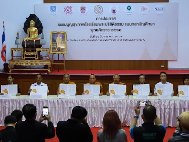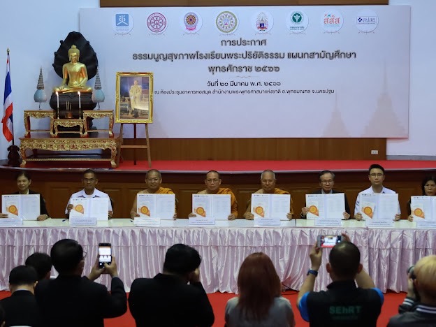 เมื่อวันที่ 20 มี.ค. 2566 คณะผู้บริหารสำนักงานคณะกรรมการสุขภาพแห่งชาติ (สช.) พร้อมด้วยหน่วยงานภาคีเครือข่ายรวม 8 องค์กร ร่วมกันทำพิธีประกาศธรรมนูญสุขภาพโรงเรียนพระปริยัติธรรม แผนกสามัญศึกษา พ.ศ.2566 ณ สำนักงานพระพุทธศาสนาแห่งชาติ อ.พุทธมณฑล จ.นครปฐม เพื่อเป็นการสร้างความร่วมมือด้านการขับเคลื่อนสุขภาวะในโรงเรียนพระปริยัติธรรม แผนกสามัญศึกษา และส่งเสริมการมีส่วนร่วมของพระสงฆ์ สามเณร บุคลากรในโรงเรียน ชุมชน และสังคม ในการพัฒนาและขับเคลื่อนนโยบายสาธารณะแบบมีส่วนร่วม