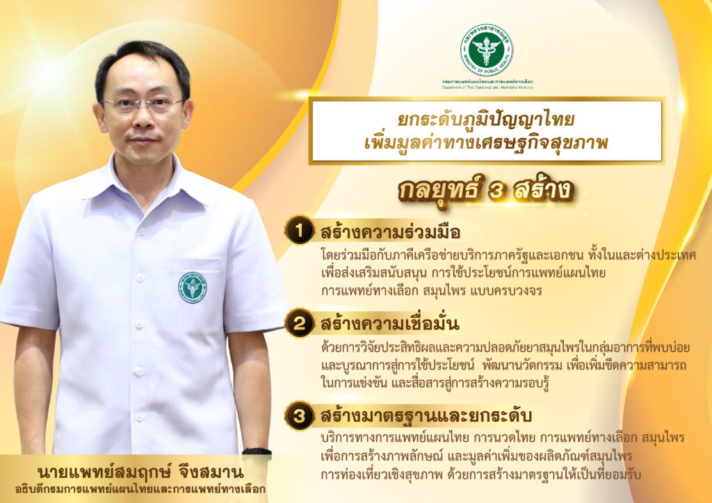 หมอสมฤกษ์ รับตำแหน่งอธิบดีกรมแพทย์แผนไทยฯ ตั้งเป้าปี 68 ยกระดับภูมิปัญญาไทยสู่การเพิ่มมูลค่าเศรษฐกิจสุขภาพด้วยกลยุทธ์ 3 สร้าง : สร้างความร่วมมือ สร้างความเชื่อมั่น และสร้างมาตรฐาน