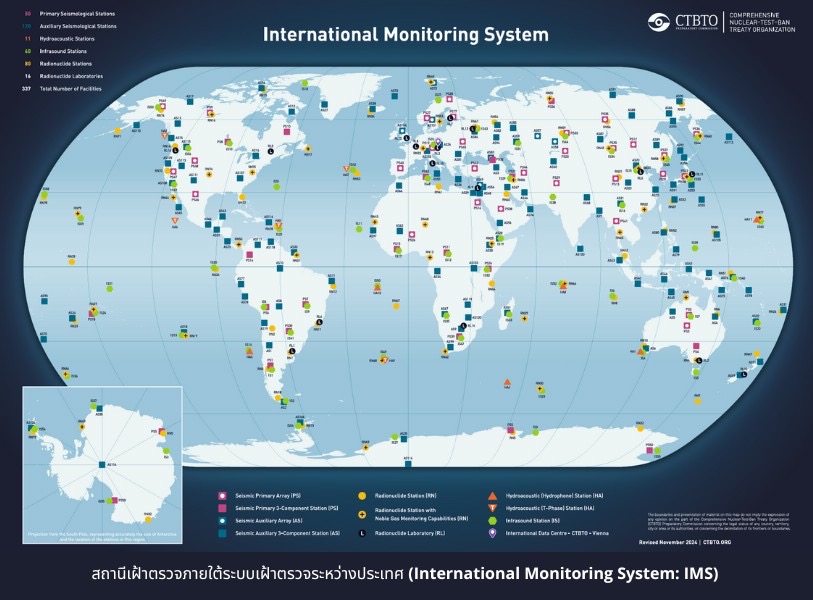 ทั้งนี้ ประเทศไทยในฐานะภาคีสมาชิกที่ให้สัตยาบัน CTBT ตั้งแต่ปี 2561 โดยมี สำนักงานปรมาณูเพื่อสันติ (ปส.) เป็นหน่วยงานหลักในการดำเนินการตามพันธกรณีระหว่างประเทศ ได้แสดงบทบาทสำคัญอย่างต่อเนื่อง ทั้งในการพัฒนาโครงสร้างพื้นฐานทางเทคนิค การส่งเสริมการใช้ข้อมูลเพื่อประโยชน์สาธารณะ และการเสริมสร้างความร่วมมือกับประชาคมโลกด้านการตรวจสอบการทดลองอาวุธนิวเคลียร์ โดยในปัจจุบัน ประเทศไทยมี สถานีเฝ้าตรวจการทดลงอาวุธนิวเคลียร์ภายใต้ระบบเฝ้าตรวจระหว่างประเทศ (International Monitoring System: IMS) จำนวน 2 แห่ง ได้แก่