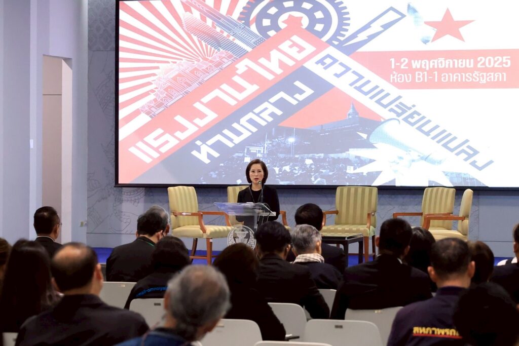 ทั้งนี้ในวันเดียวกันนี้ นางสาวตรีนุช เทียนทอง รัฐมนตรีว่าการกระทรวงแรงงาน ได้ปาฐกถาพิเศษ ในหัวข้อ “ทิศทางการเปลี่ยนแปลงกระทรวงแรงงาน ภายใต้การเปลี่ยนแปลง” ว่า ช่วงเวลานี้เป็นช่วงเวลาหัวเลี้ยวหัวต่อที่ทุกภาคส่วนต้องร่วมกันวางรากฐานแรงงานให้เข้มแข็ง เพื่อขับเคลื่อนประเทศไทยให้พร้อมแข่งขันในเวทีโลก ซึ่งปัจจุบันประเทศไทยกำลังเผชิญกับคลื่นแห่งการเปลี่ยนแปลงขนาดใหญ่ ซึ่งส่งผลกระทบโดยตรงต่อเสถียรภาพและความมั่นคงในชีวิตการทำงานของคนไทย โดยมีปัจจัยสำคัญๆ 4 ด้านหลักๆ คือ 1) โครงสร้างประชากร (Aging Society) ที่ขณะนี้เราได้ก้าวสู่ความเป็นสังคมผู้สูงอายุโดยสมบูรณ์แล้ว ในอีกด้านหนึ่ง อัตราการเกิดก็ลดน้อยลงอย่างฉับพลัน ทำให้สัดส่วนประชากรวัยแรงงานลดลง เกิดปัญหาการขาดแคลนแรงงาน โดยเฉพาะในภาคอุตสาหกรรมที่ยังคงต้องพึ่งพาแรงงาน 2) ความท้าทายจากเทคโนโลยี ที่มีเทคโนโลยีดิจิทัลและปัญญาประดิษฐ์ (AI) เข้ามา เป็นการเปลี่ยนแปลงขนานใหญ่ของเทคโนโลยี 3) การขาดแคลนแรงงานทักษะ แม้ว่าอัตราการว่างงานโดยรวมจะต่ำ แต่ปัญหาเชิงโครงสร้างที่เรากำลังเผชิญ คือ การขาดแคลนแรงงาน (Labour Shortage) ที่มีทักษะตรงตามความต้องการ และสุดท้าย 4) นโยบายการค้าที่เข้มข้นของสหรัฐฯ ที่ทำให้ไทยได้รับผลกระทบภาษีส่งออกที่เก็บอัตราร้อยละ 19